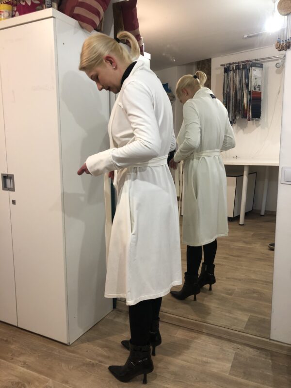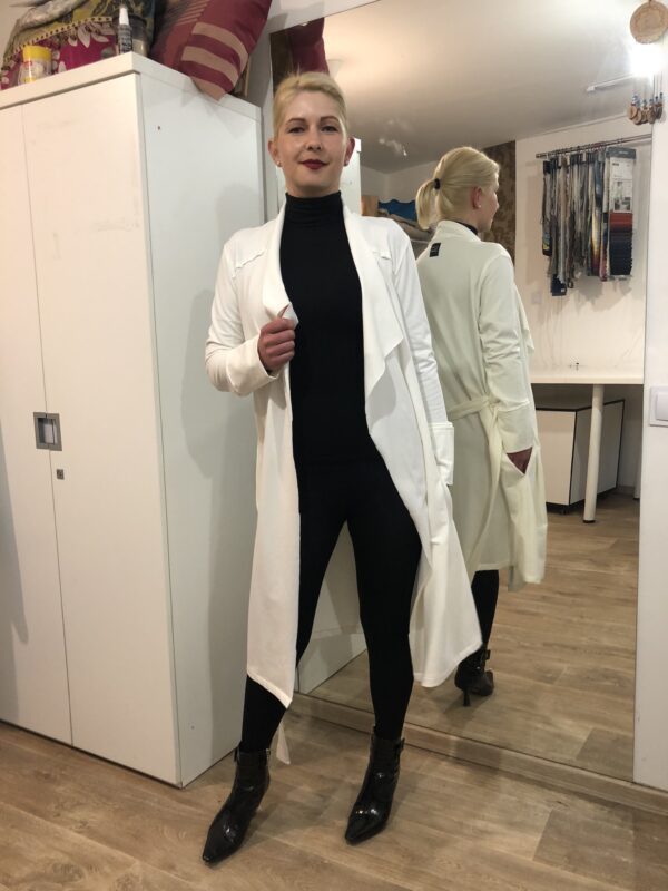 Design: Ležérní cardigan s volným límcem a prodlouženou linií zadního dílu, který elegantně přechází do předního — inspirován vojenským stylem v jemném, ženském provedení. Styl doplňuje poutko za krkem a ozdobně prošitý pásek.