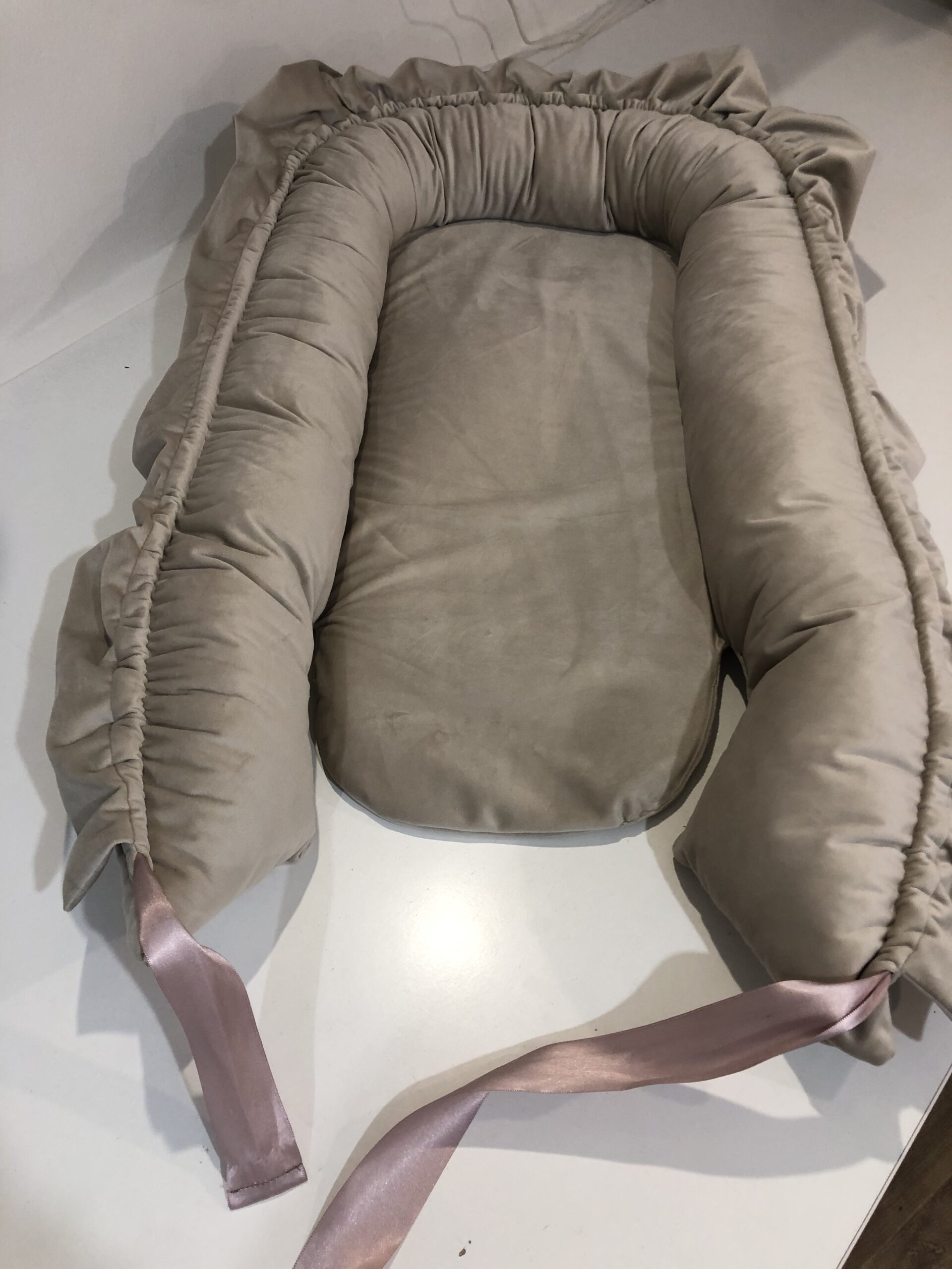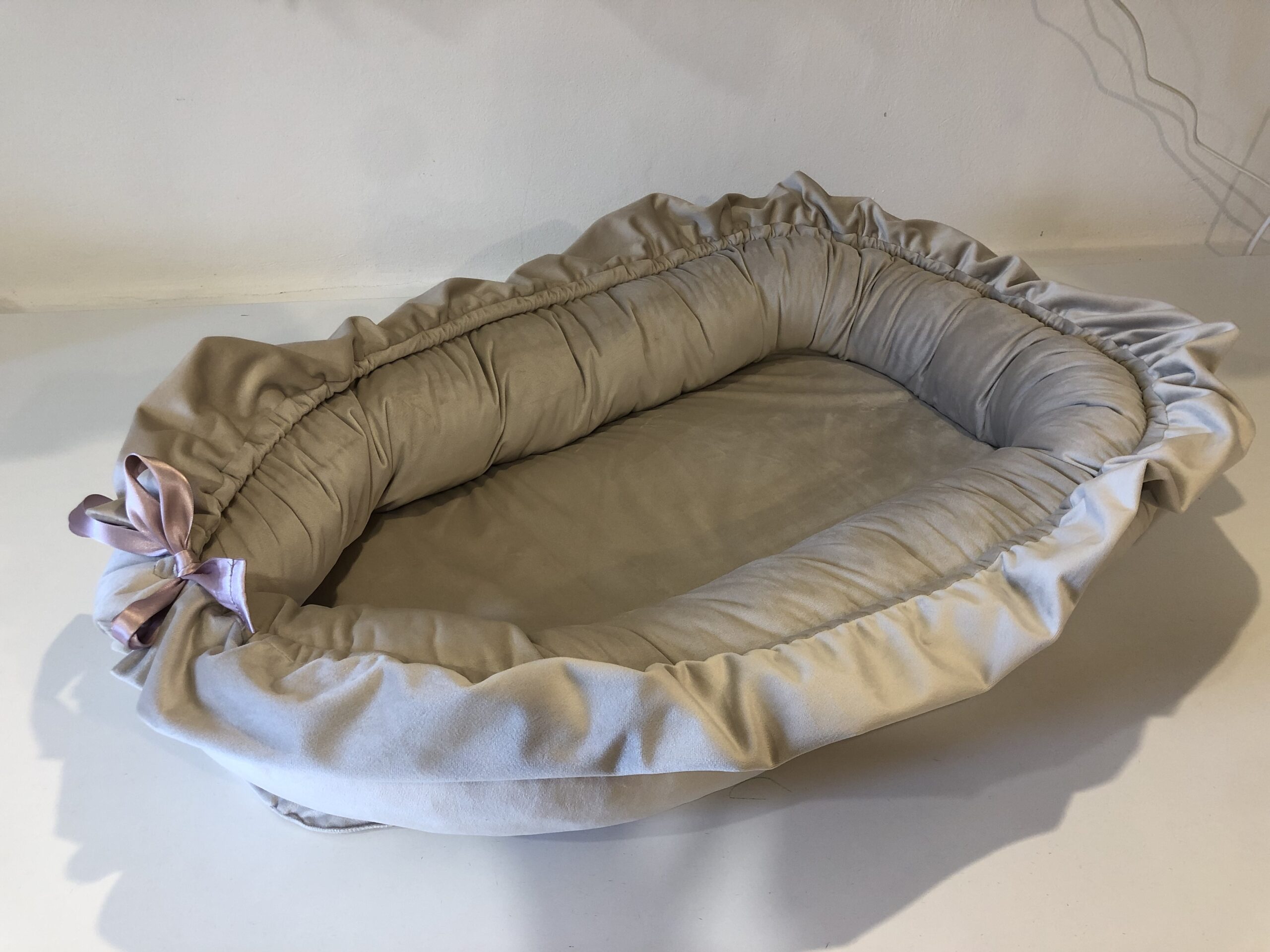 Elegantní a jemné hnízdečko pro miminko v neutrálním odstínu pro pocit bezpečí. Zdobené saténovou stuhou, která plní praktickou i dekorativní funkci, je hnízdo krásným doplňkem každého dětského koutku či postýlky. Díky lehkému volánu po obvodu působí jemně .