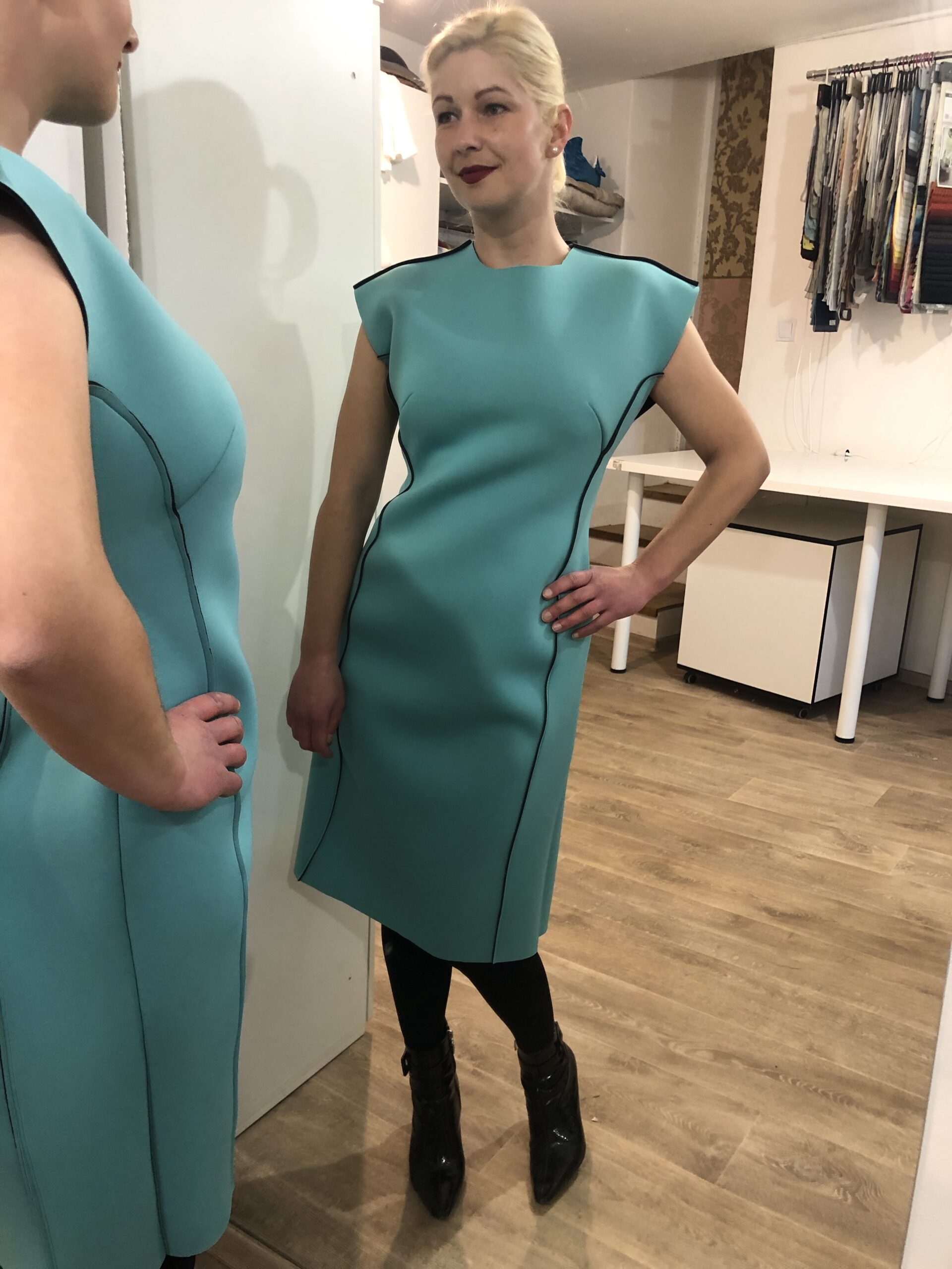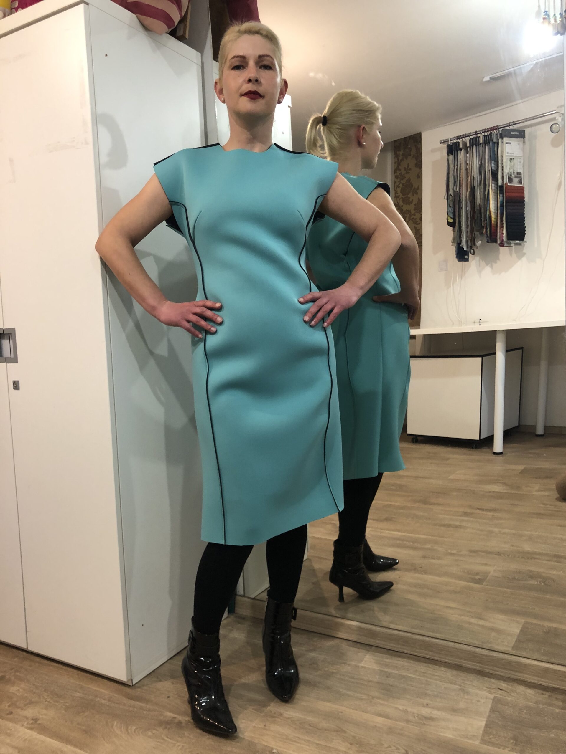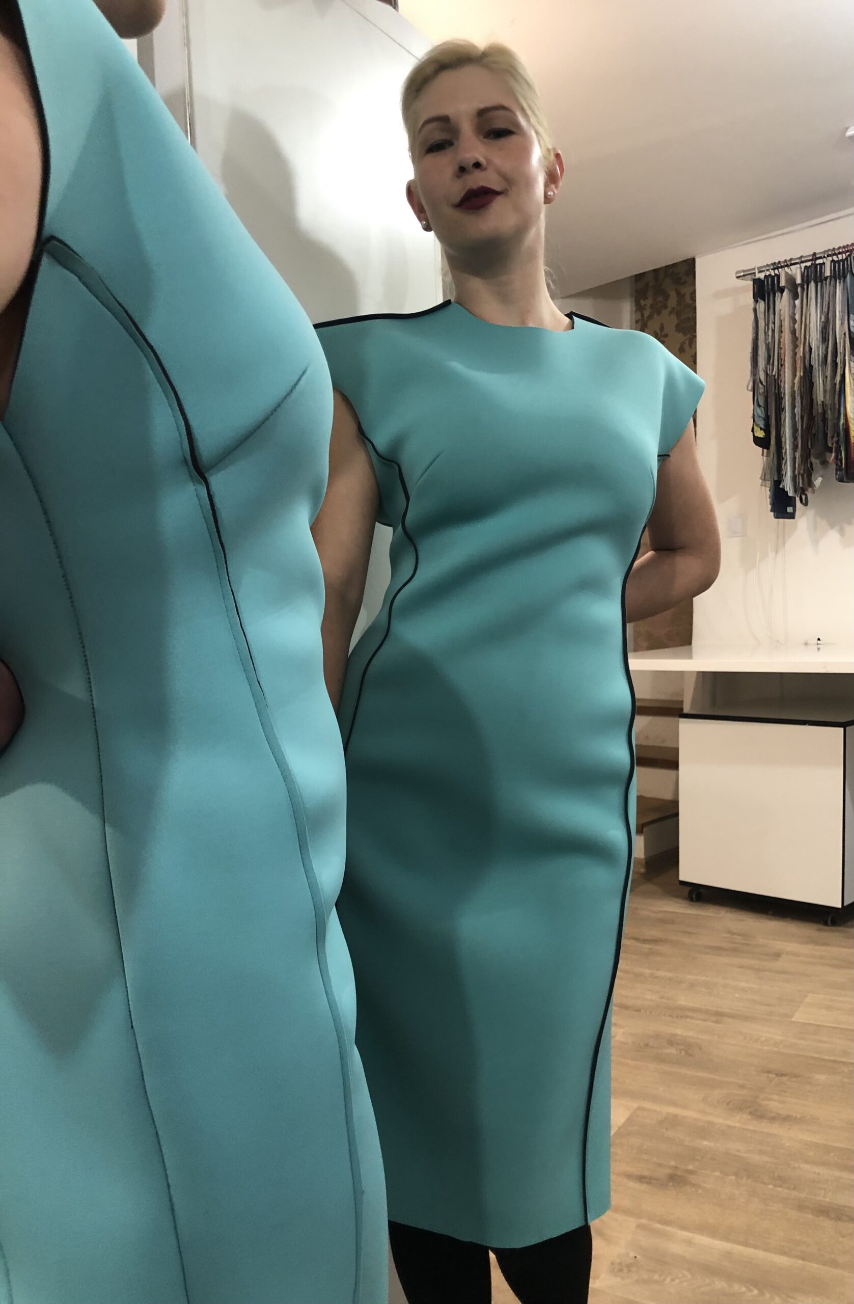 Design: Šaty mají moderní, tvarující střih s elegantním členěním na předním i zadním díle. Překlopený efekt látky dodává šatům originální vzhled a jemnou asymetrii. Prsní záševky a projmutí v pase krásně zvýrazňují ženskou postavu.