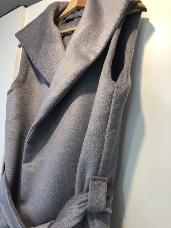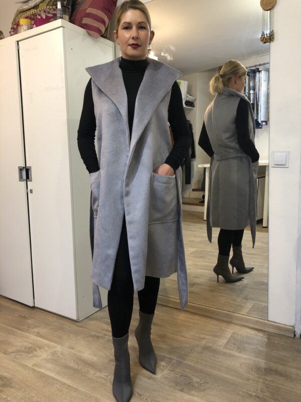 Design: Vesta má nadčasový střih s otevřenou klopou a páskem na zavazování, který jemně zvýrazňuje pas. Díky delšímu střihu působí elegantně a protahuje siluetu. Zadní poutko zajišťuje snadné zavěšení.